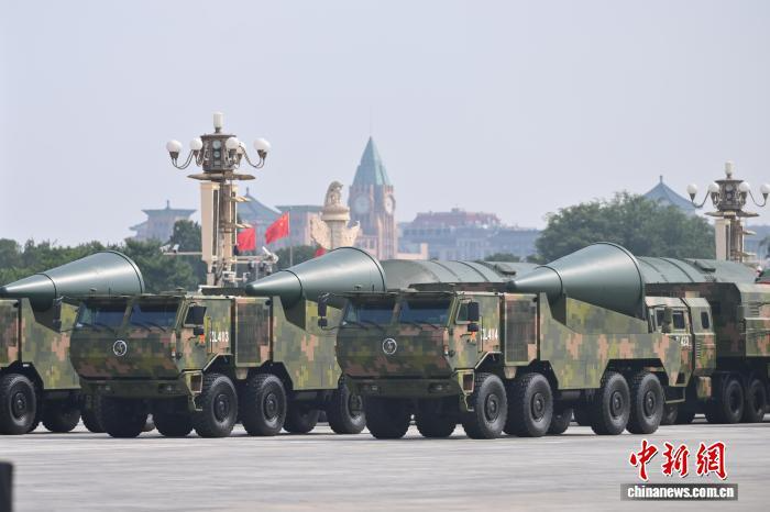 核导弹第一方队受阅导弹首次集中展示中国军队陆、海、空基“三位一体”战略核力量。作为中国战略反击体系的重要组成,“东风-5C”液体洲际战略核导弹的打击范围覆盖全球。