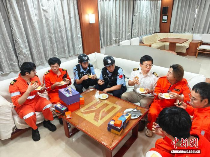 慰问活动中,民警们将精心准备的月饼礼盒送到船员手中。惊喜与感动之余,船员们纷纷用手机记录下这温馨的时刻。大家围坐在一起,品尝着香甜的月饼,闲话家常。
