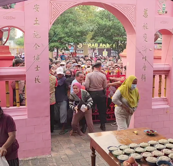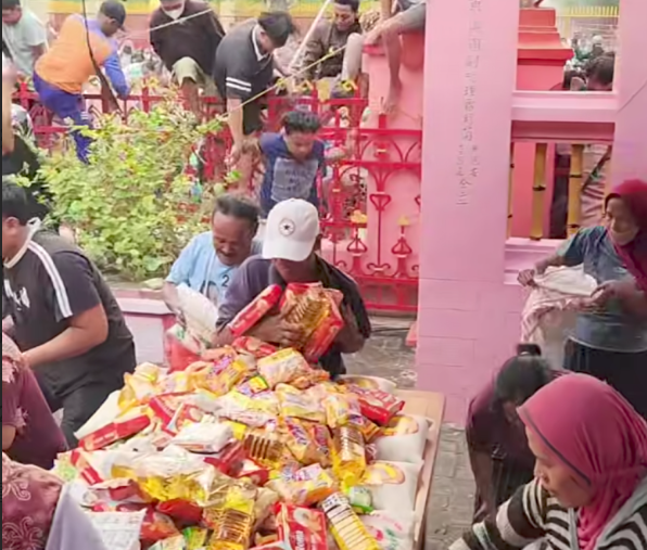 居民们蜂拥而至领取物资;庙方还向庙外居民分发面条,使现场氛围热闹非凡,充满