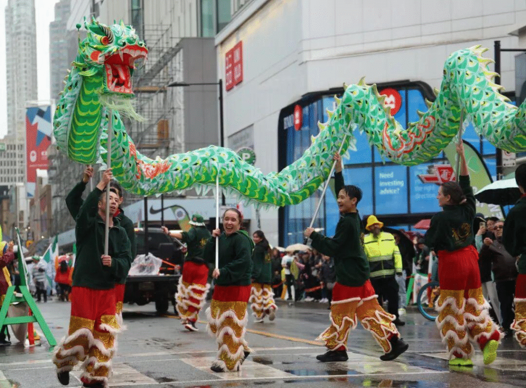 当地时间2025年3月16日,加拿大多伦多,在庆祝爱尔兰民族传统节日圣帕特里克节(St. Patrick’s Day)的大游行中,一支中式舞龙队舞动绿色长龙。
