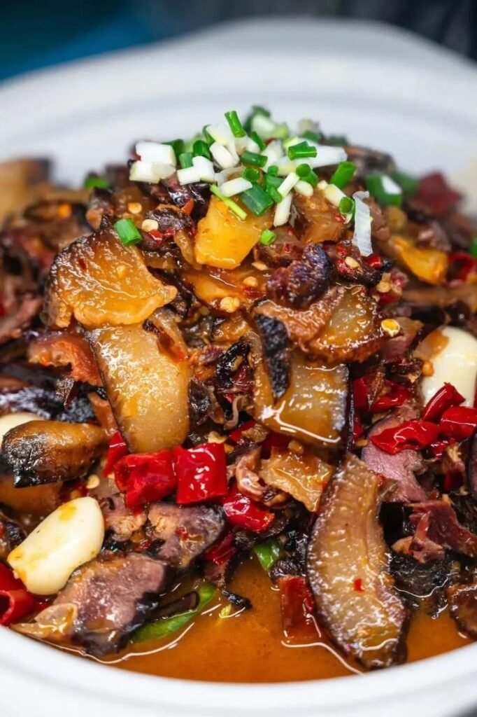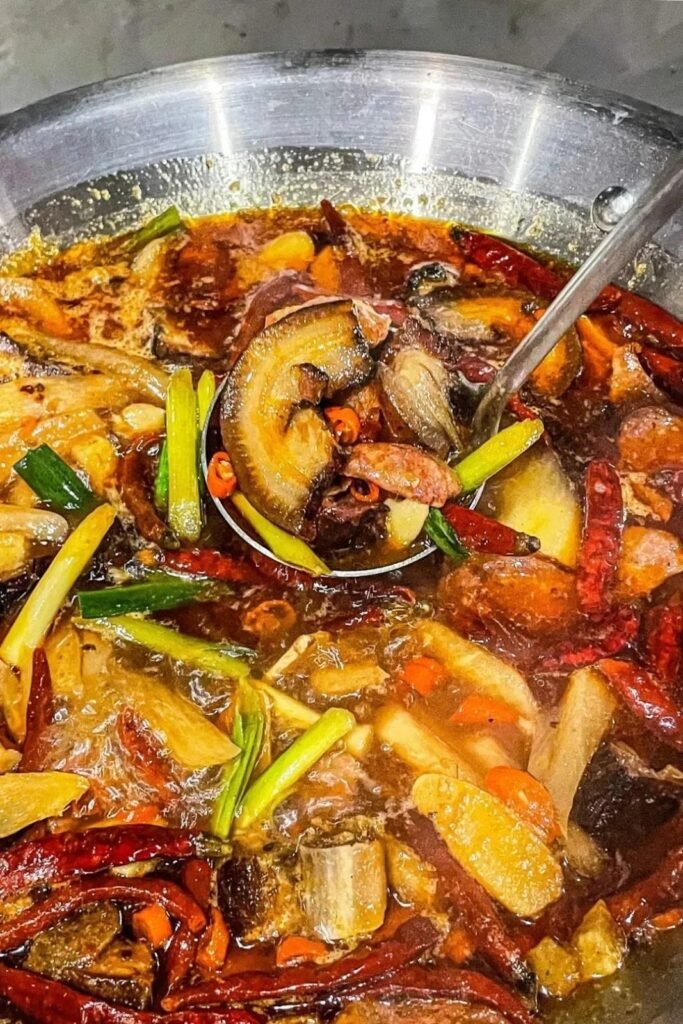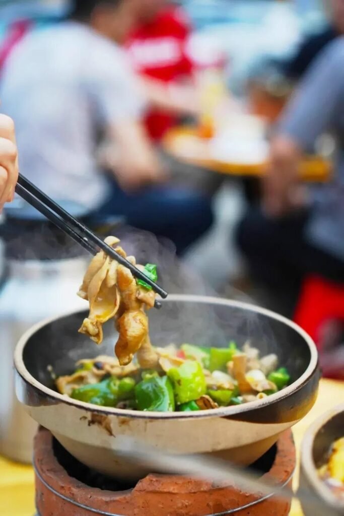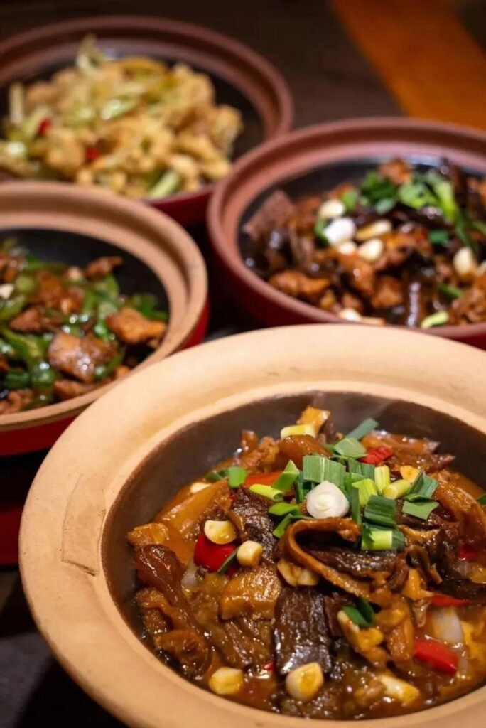 和北方口味清甜的炖菜不同,湖南的炖菜仍旧不改湘菜的火辣本色。先炒再煨的方式,使其口感和小炒有着一脉相承的香浓:常德的钵子菜颜色红艳开胃,裹着浓郁汤汁的谷鸭、土鸡炖得软烂,入口就能抿化,还有肥肠钵、脑花鱼杂钵,都是油脂的天堂;湘西则以各类腊肉下锅,腊肉的油香与辣椒香在锅中交织共舞,辣味从舌尖直送心坎;而湘江沿岸的土菜馆里,各式山鲜湖鲜任君采撷,洞庭湖的湖藕炖筒子骨,浏阳的粉皮炖黑山羊,都是吃不尽的地道美味…….