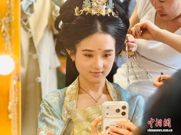 在西安大唐芙蓉园的汉服店见到朱溪瑞时,现实中的她和视频中那个“下达通知”的博主判若两人。她正对着一排排汉服犹豫不决,动作慢得像是在挑选心爱的饰品,和视频里那个火力全开的女孩像是两个人。她更像是一个刚赶了很久的路,在时光褶皱里偷偷喘息的邻家女孩。