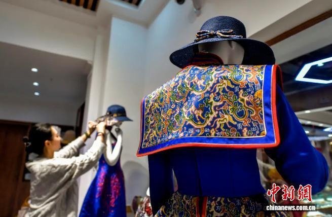 2024年1月11日,新疆乌鲁木齐市二道桥大巴扎非遗文创馆,工作人员在整理融入“五星出东方利中国”织锦护膊图案的服饰。