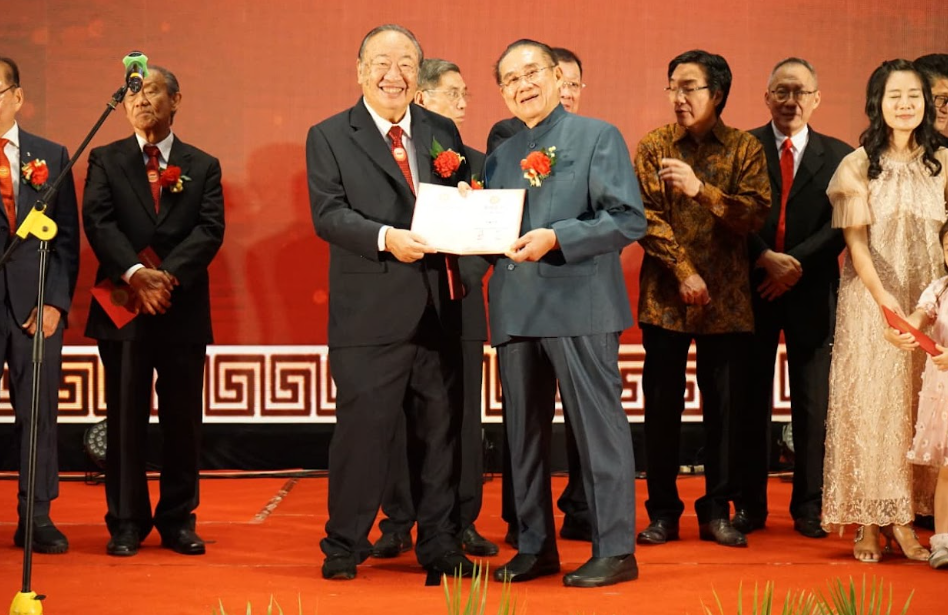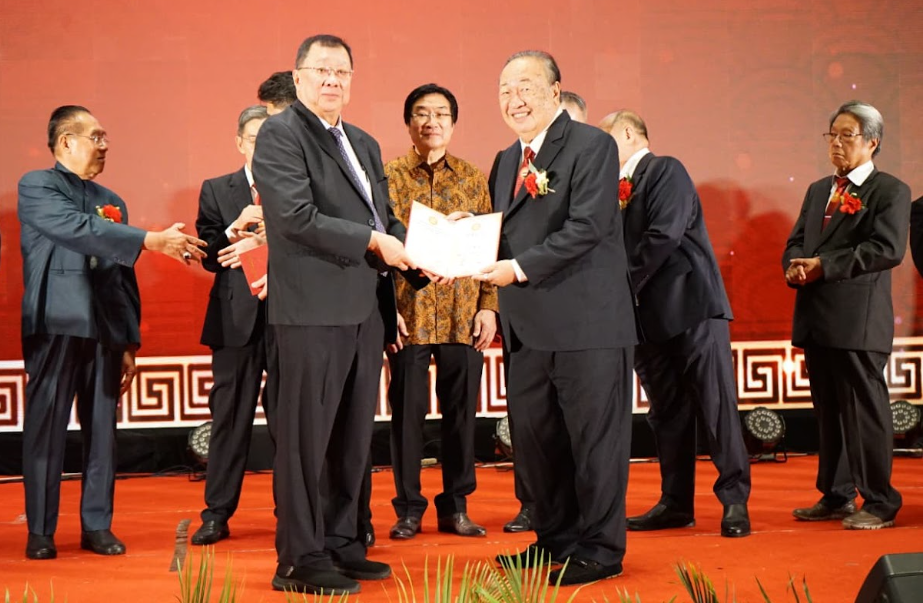 张锦雄总主席受邀上台,为中爪哇分会永久名誉主席吴孝忠先生与陈福全先生颁发荣誉证书;
