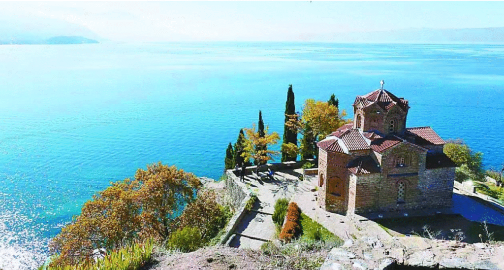当地人说,奥赫里德曾有365座教堂,一年里每天都能走进不同的建筑。这个说法或许略显夸张,但从山坡上向下望去,的确能看到许多古老建筑的轮廓,红瓦屋顶与塔楼在林木间若隐若现。