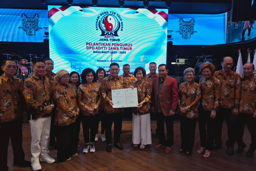【泗水讯】印尼东岳太极拳协会东爪哇分会2025–2029年理事会于8月21日晚在泗水九龙餐厅隆重就职。傅美莲女士正式接任分会主席,并从总会长黄耀汉先生手中接过会旗与任命书。