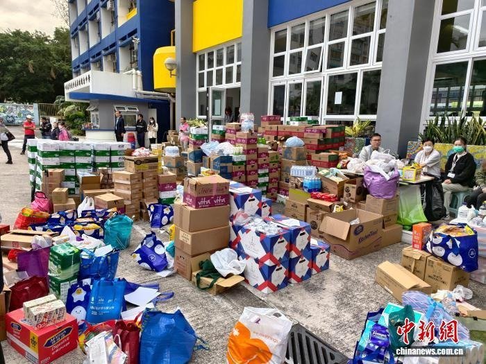 11月27日,香港大埔宏福苑附近的中华基督教会冯梁结纪念中学内摆满捐赠物资。