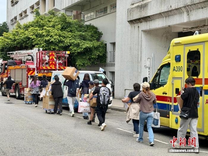 11月27日上午,有香港市民在香港大埔宏福苑附近运送救援物资。