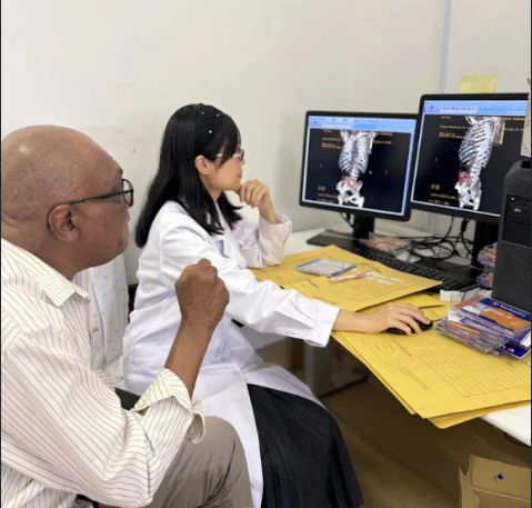 在非洲X地诊室,一位中国医生与当地同仁并肩探讨病例。