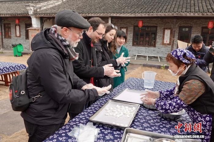 2月1日,外籍人士在浙江宁波江北区慈城镇半浦村体验制作汤圆,感受乡村“年味”。