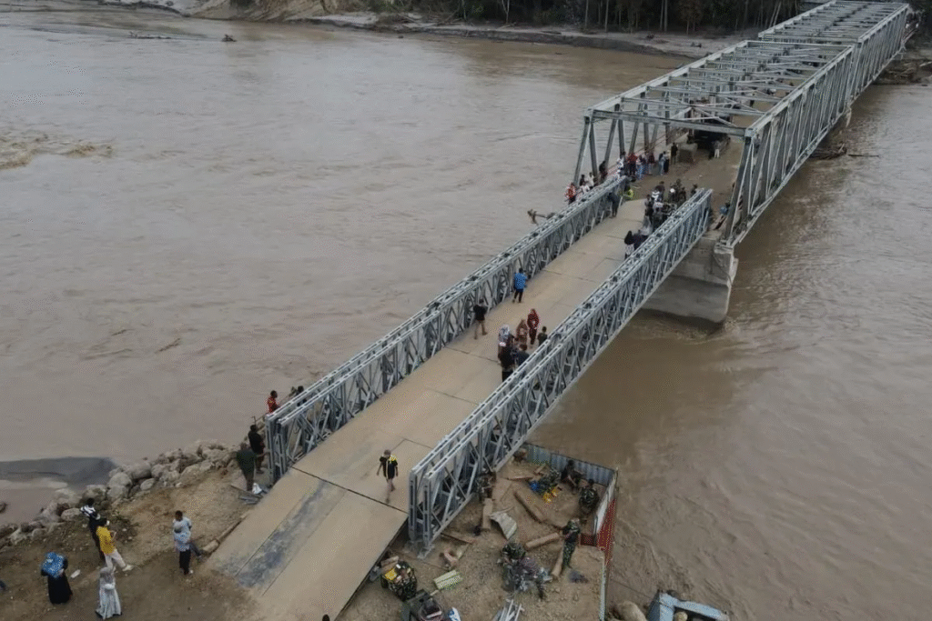 (班达亚齐讯)连接亚齐省比里云县(Bireuen Regency)与班纳梅里亚县(Bener Meriah)的国家公路关键节点——特宾马尼(Teupin Mane)贝雷桥已成功建成并恢复双向通车,两地交通由此恢复正常。