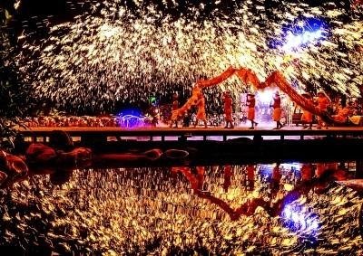 10月5日,在四川省成都市双流区黄龙溪古镇,民间艺人表演非遗“火龙灯舞”。