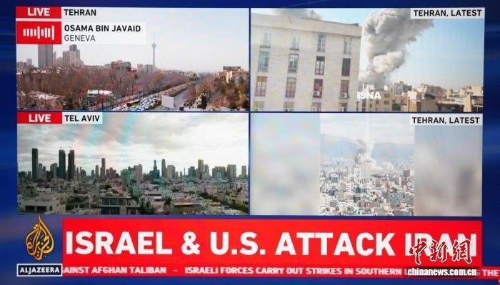 图为2月28日拍摄的半岛电视台直播画面,显示美国与以色列对伊朗发起联合军事行动。新华社记者 张浩波 摄