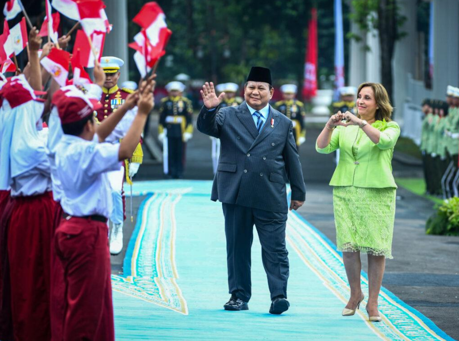 印尼总统普拉博沃在独立宫盛情欢迎秘鲁总统迪娜·博卢阿特