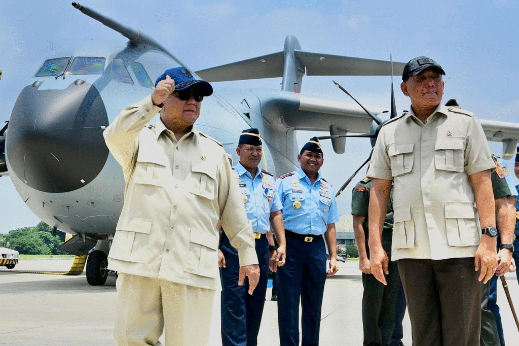 (雅加达讯)印尼总统普拉博沃·苏比安托于周一(2025年11月3日)在雅加达哈利姆·珀达纳库苏马空军基地,象征性地将一架空客A400M运输机的钥匙移交给印尼国民军总司令阿古斯·苏比扬托上将。