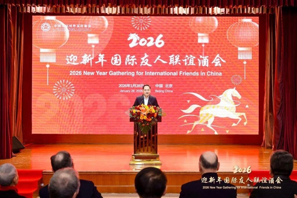 1月28日晚,中国人民对外友好协会举办2026年迎新年国际友人联谊酒会。来自45个国家的近120位国际友人与中方代表欢聚一堂,共迎马年新年。