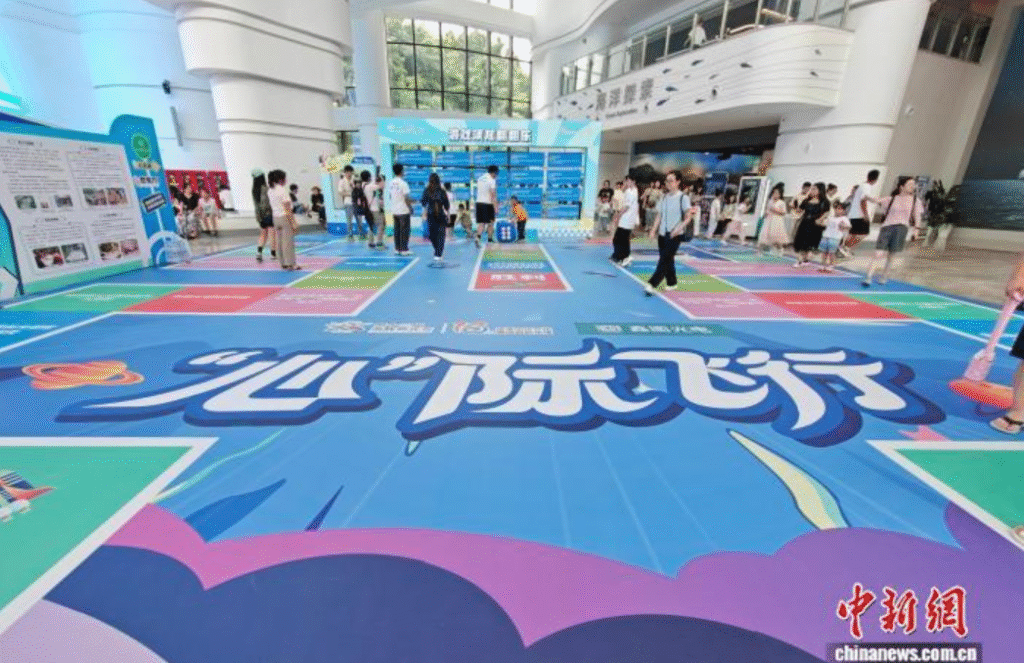 (福州讯)第十三届海峡青年荟·第三届两岸融合特教人才研学营5日在福建福州开营。活动现场,一幅156平方米的巨型飞行棋盘引发关注。