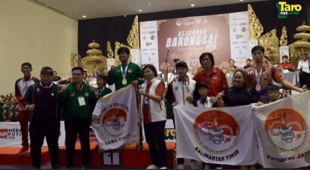 (东爪哇讯)11月24日消息,印尼舞狮体育联合会东爪哇分会代表队在2025年巴厘省 省长杯全国舞狮锦标赛中获得总冠军,共斩获4枚金牌和2枚银牌。